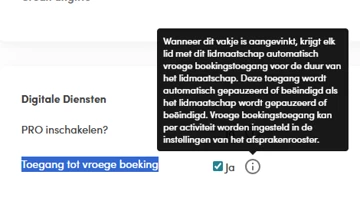 De functie vroege boeking kan worden aangezet in het lidmaatschap, maar is alleen van toepassing in het afsprakenrooster. Helaas is deze functie niet bruikbaar in het oude rooster.