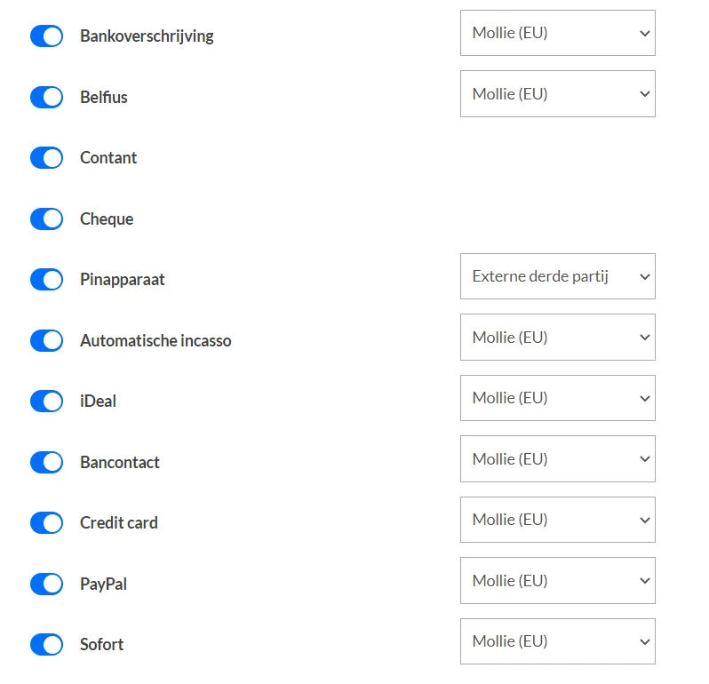 Om de betaalmethoden in te schakelen en op te slaan, is het noodzakelijk om de blauwe schakelaar aan de linkerkant van de methode, te activeren. Je vindt de betaalmethoden via Systeeminstellingen > Betaalmethoden.