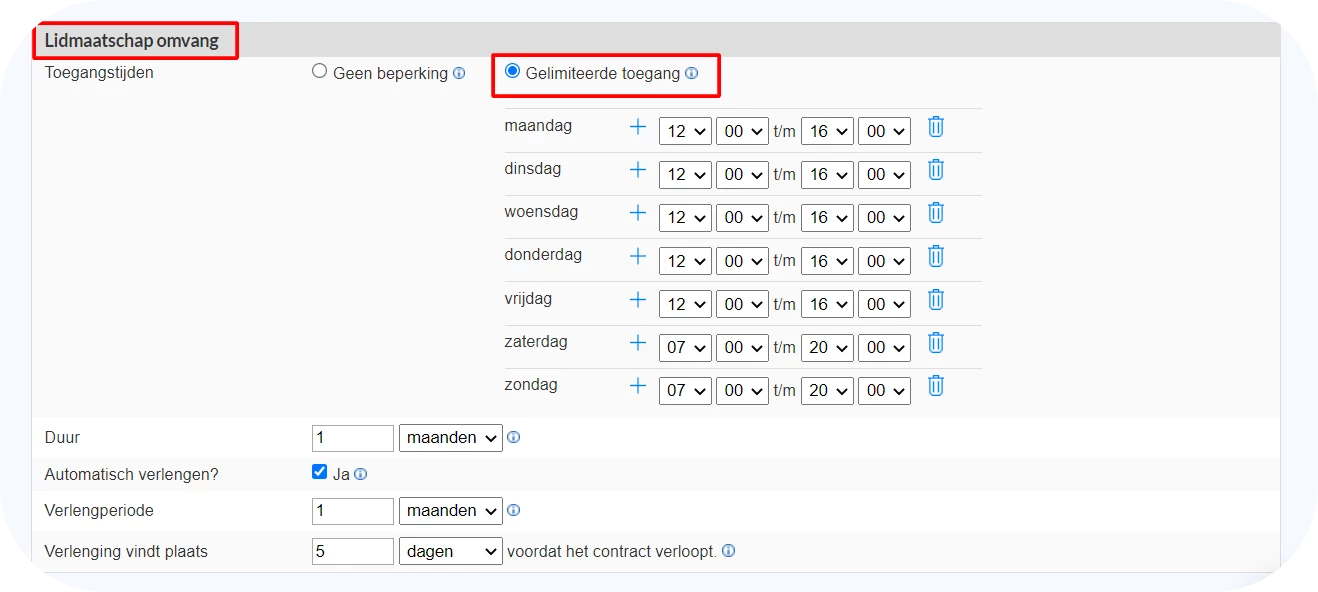 Wanneer je gebruik wilt maken van beperkte toegangstijden dien je dit eerst aan te zetten in het lidmaatschap.