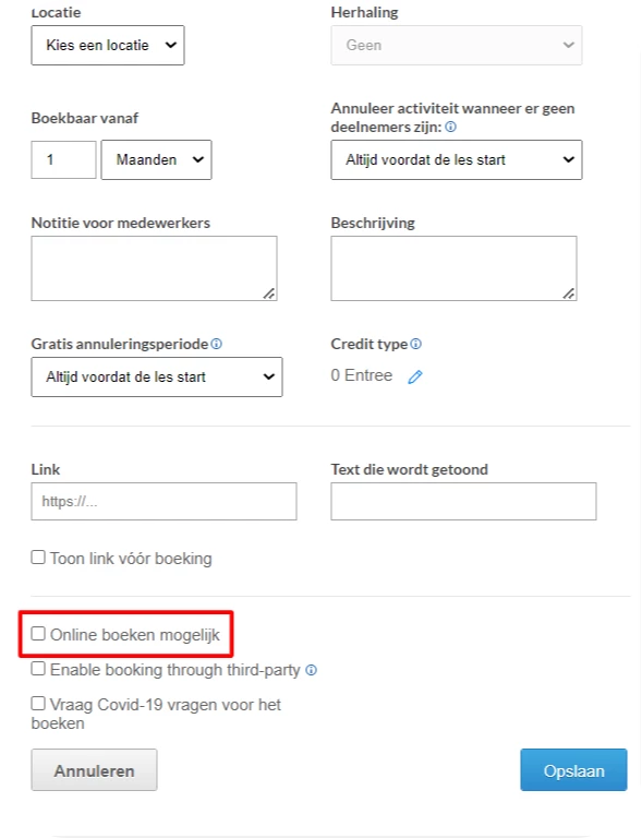 Wanneer je kiest voor deze optie en je boeken beschikbaar maakt voor je leden, zorg er dan voor dat het vakje bij “Online boeken mogelijk” wel aangevinkt staat. Nu kunnen leden zichzelf inboeken voor lessen via de website en mobiele app. Wanneer je credits koppelt aan een les, zorg er dan voor dat de juiste klanten deze credits op hun account hebben.