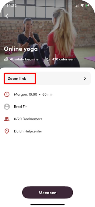 - Je hebt de optie om de link vóór of na het boeken te tonen. Op die manier kun je ervoor zorgen dat leden de les moeten reserveren alvorens mee te kunnen doen via de link. Leden kunnen de link zowel op de computer als via de telefoon terugvinden onder hun boekingen.