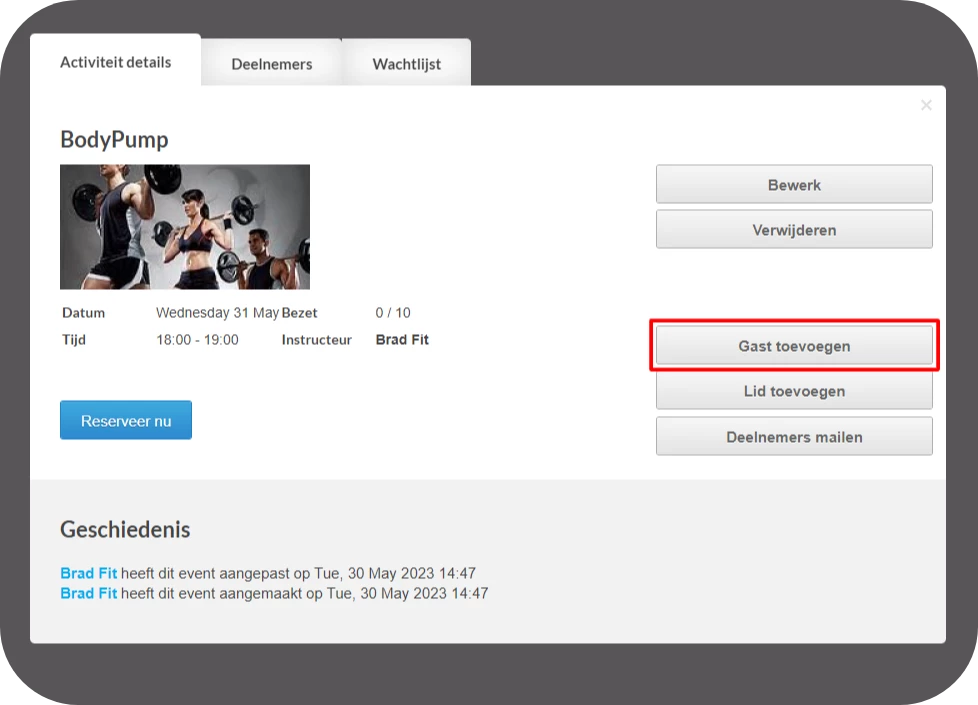 Let op! Ook wanneer je credits aan je les hebt gekoppeld kun je gasten toevoegen. Je kunt zelf bepalen of je handmatig een gastfactuur wil aanmaken om de gast te factureren voor deze les of dat deze gratis is. Je kan er ook voor kiezen om een credit af te trekken bij het lid die de gast heeft meegebracht.